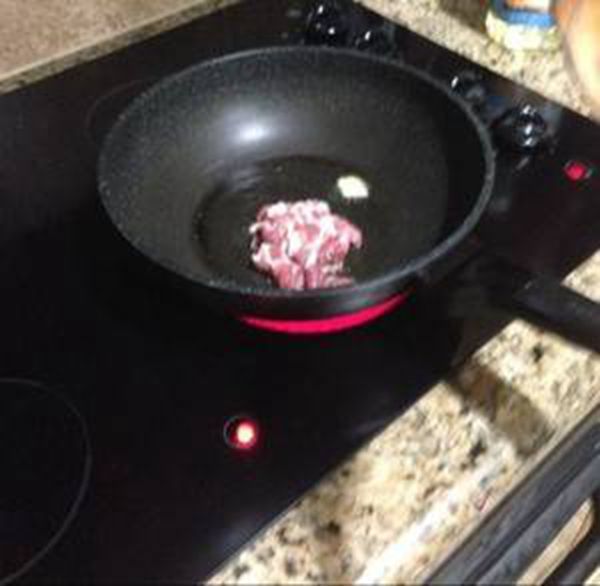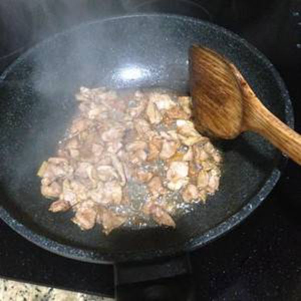 3、锅中放入食用油,烧热后放入肉和姜,一起翻炒。