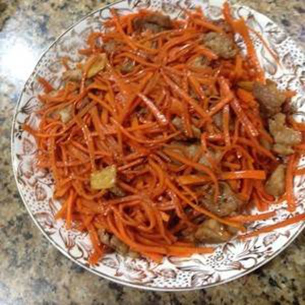 5、倒入胡萝卜丝,与肉一起翻炒均匀后,加入适量盐,继续翻炒,至快出锅时加入一小勺糖,翻炒均匀后即可出锅。