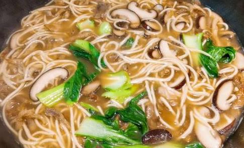 4、炒锅置火上烧热,倒入花生油,投入姜末,再放入鸡丝和蘑菇煸炒几下,倒入鲜汤,加入精盐、味精调好口味烧开,浇在面条上盛入碗内即可食用。